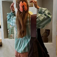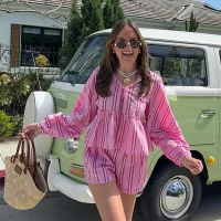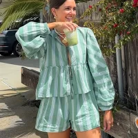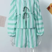Casual Stripe Shirt Shorts Sets Women Loose Bow Lace Up Hollow Out Long Lantern Sleeve Female Suit 2024 Summer Beach Lady Set