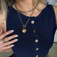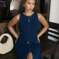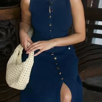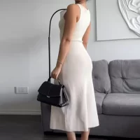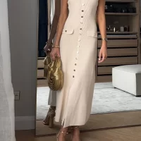 Elegant Knitted Long Dresses Women Slim O Neck Sleeveless Single Breasted Fake Pockets Dress 2024 New Fashion Office Lade Robe