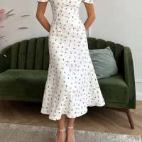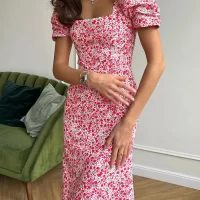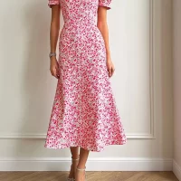 Women’s Summer Midi Dress Casual Short Puff Sleeve Floral Print A-Line Dress Elegant Flowy Dress