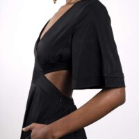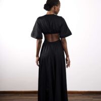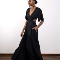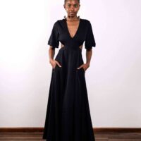 Women black long pleaded dress with side pockets, ruching and open back details.