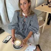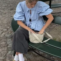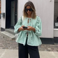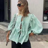 Women Fashion Print Lace Up Puff Sleeve T Shirt Elegant Casual Loose Round Neck Tops 2024 Spring New Female Commute Streetwear